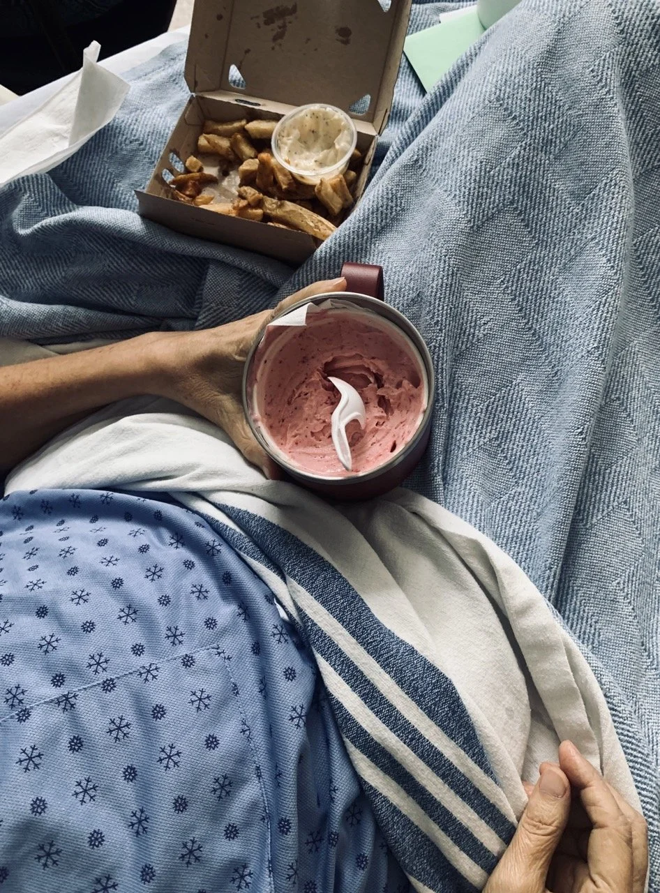 The kidney doctors visited once again to try to tackle Tammy’s low sodium. We were told just now that any liquids she consumes on top of her feeding tube administration must be paired with nutrition, rather than simple liquids. We also are now sure, after speaking with a few doctors, that it was the absolute correct decision to accept the feeding tube, as she likely would have continued withering quickly without it. This is giving us our best shot at more time with our beloved Tammy. Funny enough, once she received the tube, she developed a new surprising appetite and started making requests for food. We hadn’t seen her be excited to eat in at least a month! Some friends very quickly ran out to get everything she wanted and she did eat some of all of it.